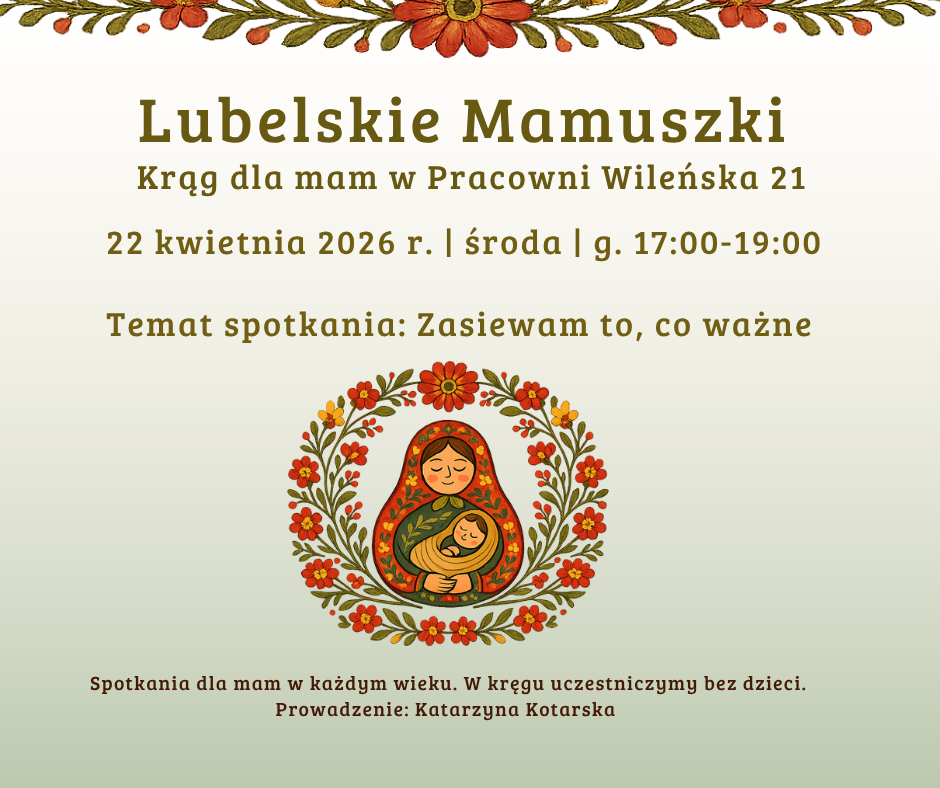 Zapraszamy Cię na wyjątkowy krąg mam – przestrzeń pełną czułości, zrozumienia i prawdziwego bycia razem. To przestrzeń dla kobiet, które tęsknią za chwilą dla siebie i za prawdziwym spotkaniem z innymi kobietami.